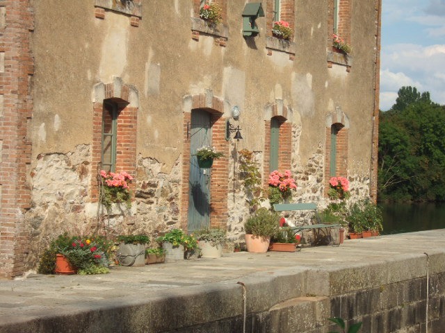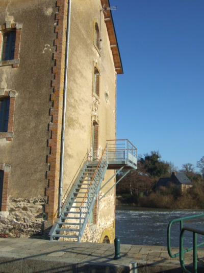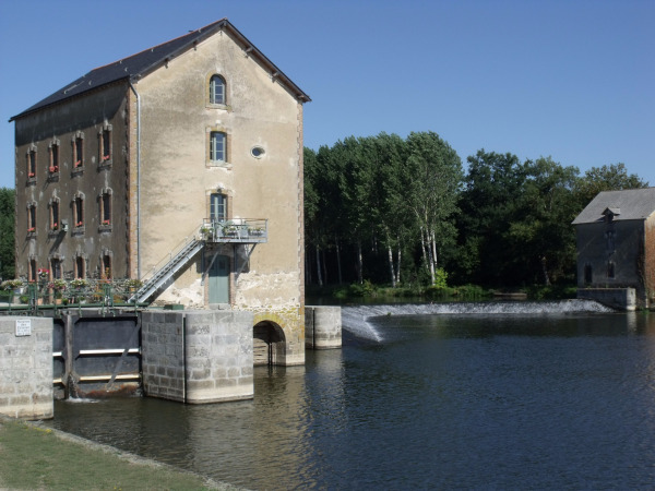 Á mi-chemin entre Laval et Château-Gontier, entre borne 59 et 60 le long de la rivière, en Mayenne, dept. 53, en Pays de la Loire, le Moulin se trouve les pieds dans l'eau, avec le chemin de halage de la Mayenne sur le seuil de la porte.